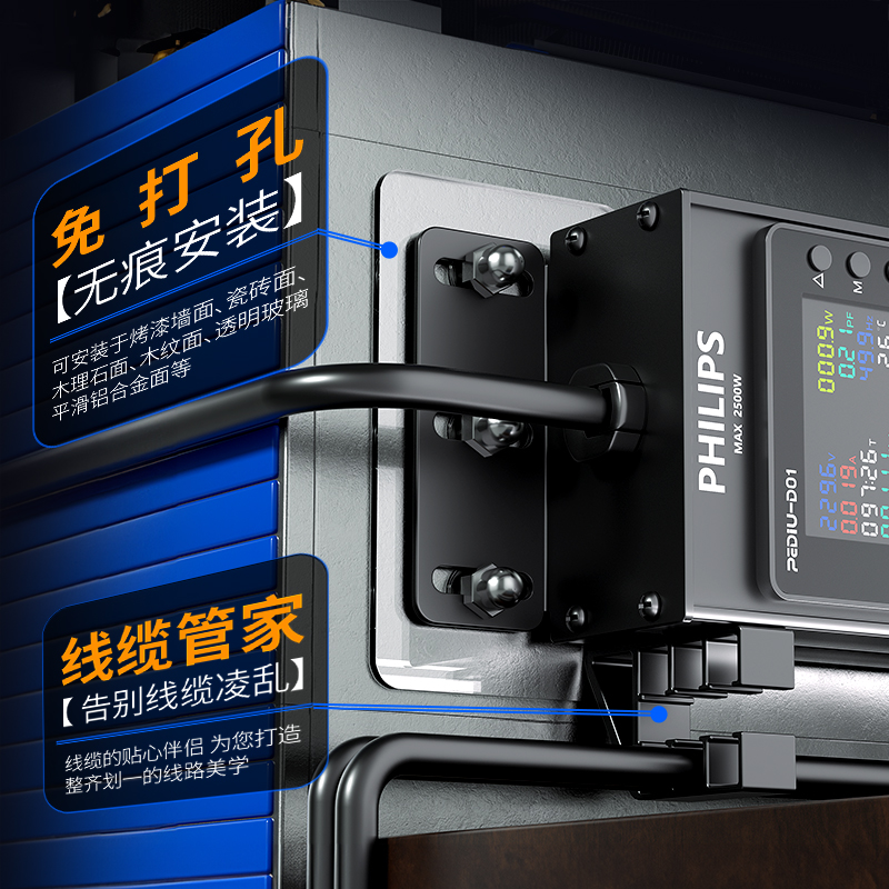2U标准尺寸,左侧进线:250V 10A输入,6位10A国标五孔输出,6位蓝色双断开关(带盖),配置PLP模块(漏电保护)+D模块(计量)+30W(1U2C),2米1.5平线+10A国标三脚插头