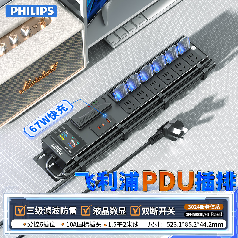 2U非标尺寸,左侧进线:250V 10A输入,6位10A国标五孔输出,6位蓝色双断开关(带盖),配置F模块(滤波防雷)+D模块(计量)+67W(1U2C);2米1.5平线+10A国标三脚插头