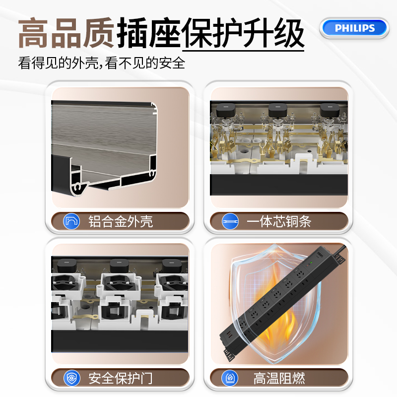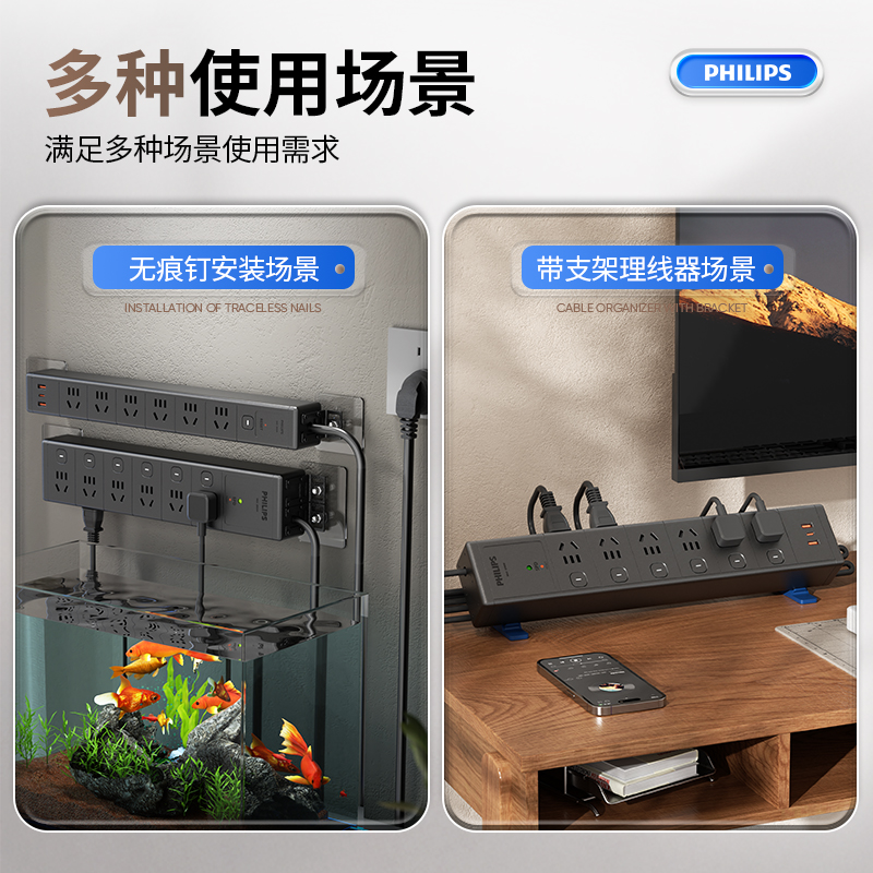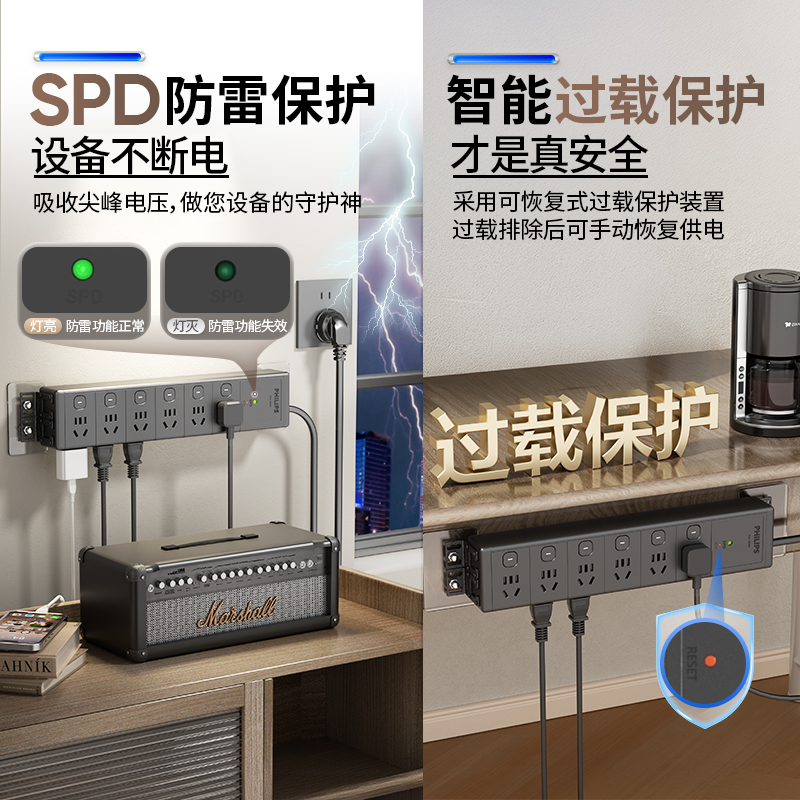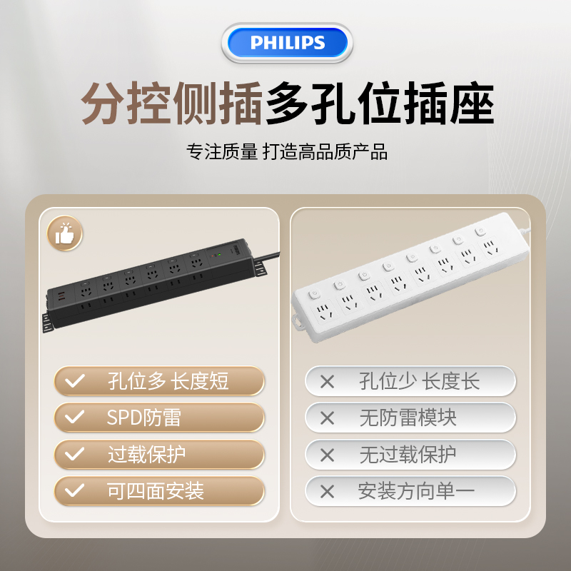 飞利浦黑色侧插分控6位独立按钮+过载保护+单灯防雷+2A1C30W+3*1.0平方毫米1.8米10A插头 右出线