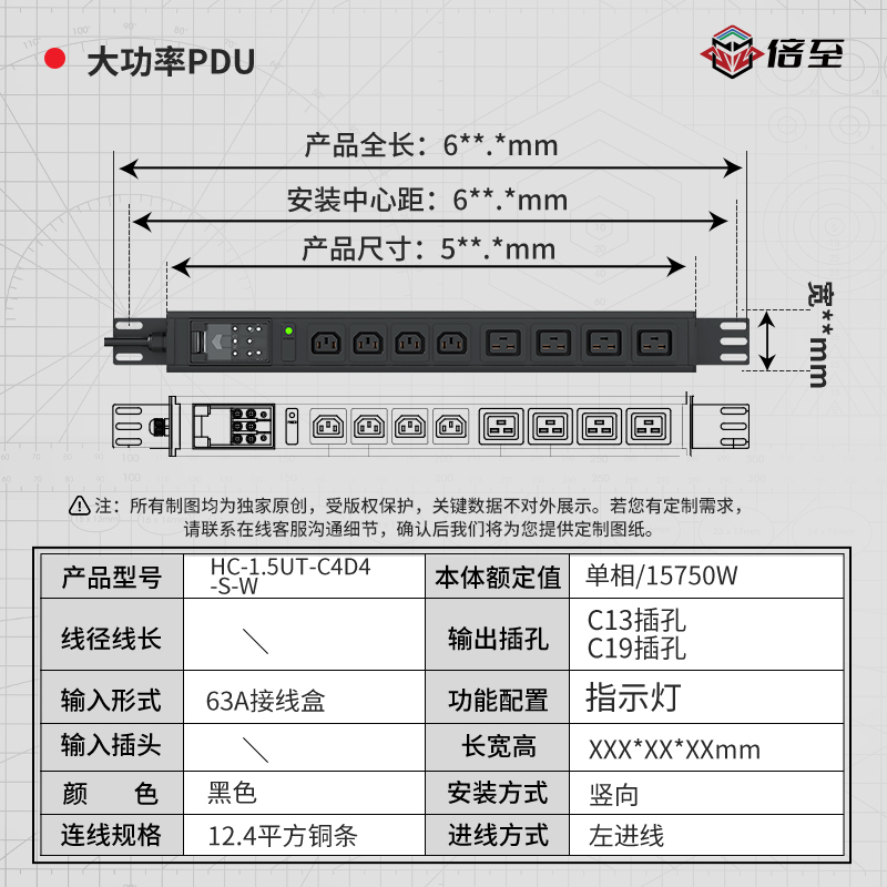 黑色封板,左进线:63A输入,1.5U,单相,4位C13插孔,4位C19插孔,1位指示灯,63A接线盒,M32防水接头