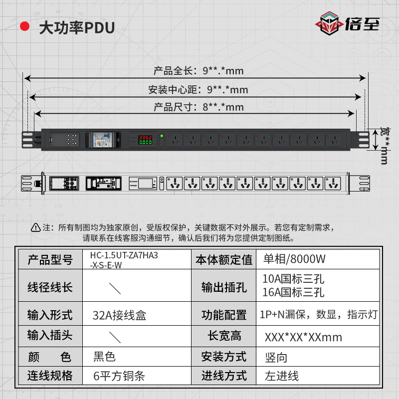 黑色封板,左进线:32A输入,1.5U,单相,10位16A国标三孔,1位1P+N漏保,数显,1位指示灯,32A接线盒,M20防水接头