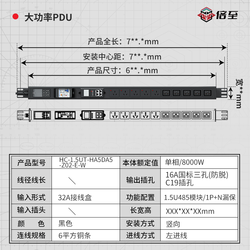 黑色封板,左进线:32A输入,1.5U,单相电,5位16A国标三孔(自锁按键),5位C19插孔,1.5U485模块,1P+N漏保,32A加长接线盒,M25防水接头