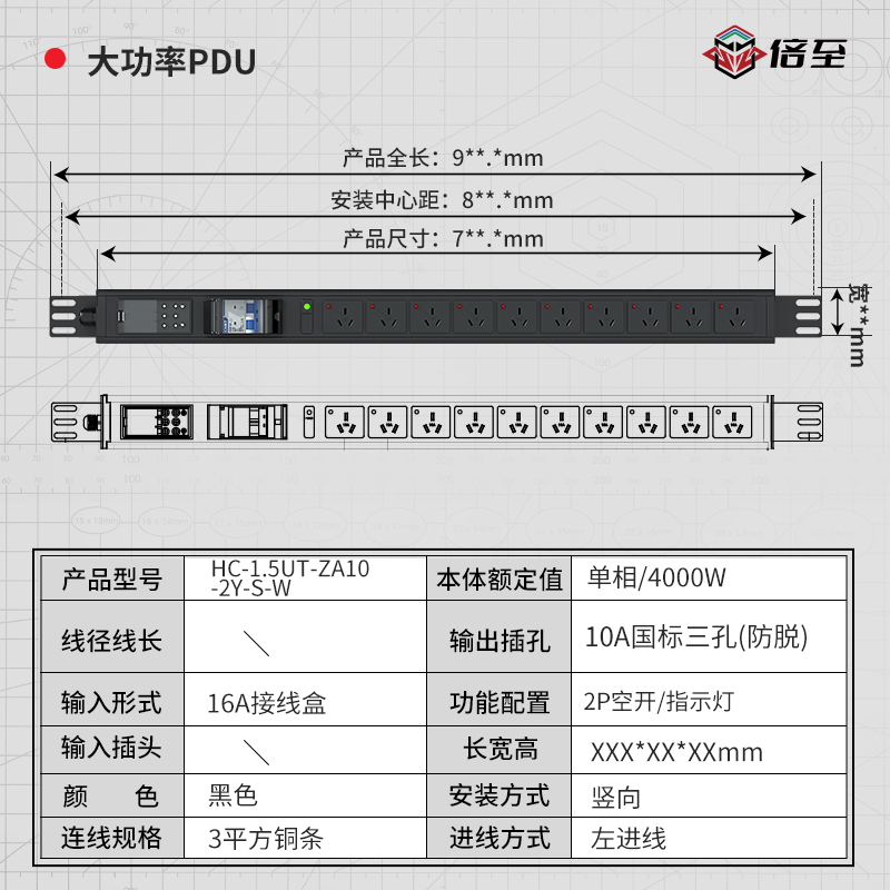 黑色封板,左进线:16A输入,1.5U,单相,10位10A国标三孔(自锁),1位指示灯,32A加长接线盒,M25防水接头