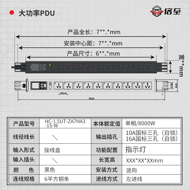 黑色封板,左进线:32A输入,1.5U,单相,7位10A国标三孔(自锁),3位16A国标三孔(自锁),1位指示灯,32A加长接线盒,M25防水接头