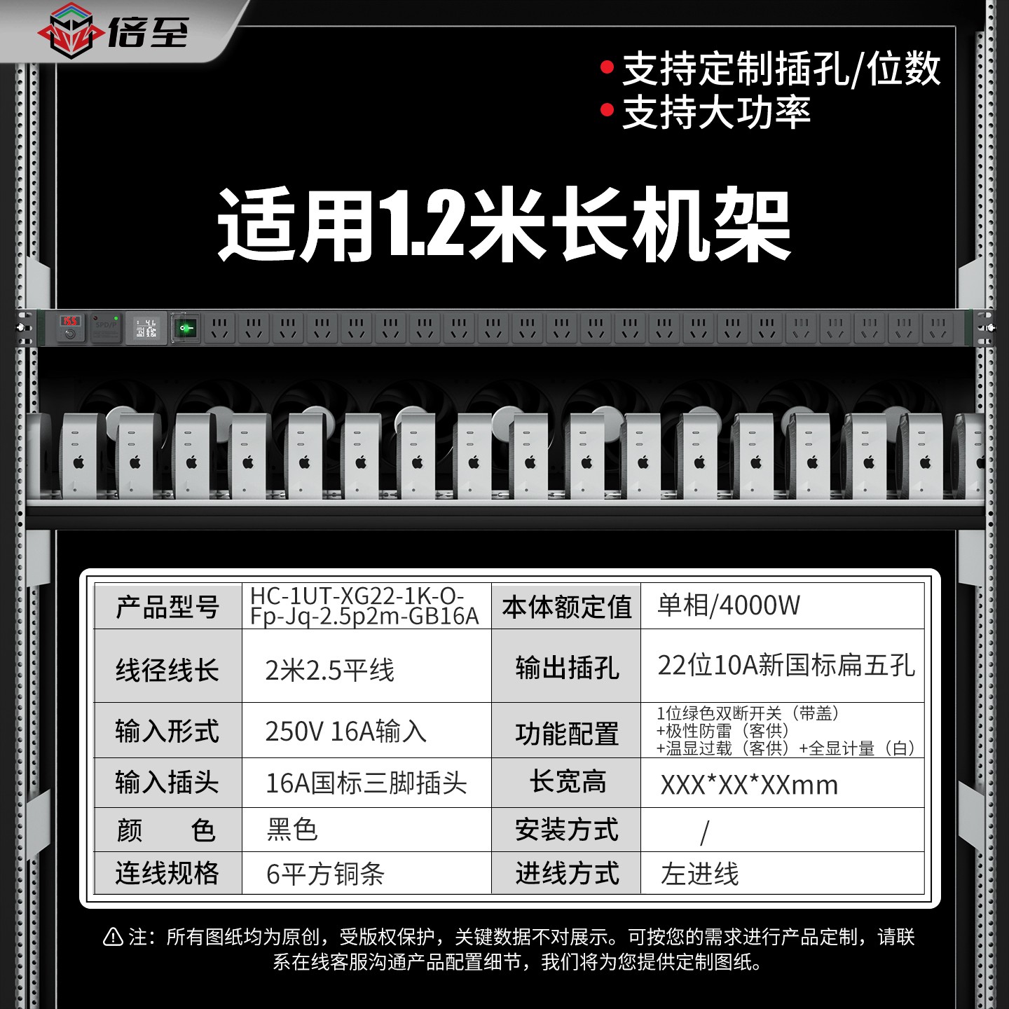 1U非标尺寸,绿色封板:250V 16A输入,22位10A新国标扁五孔+1位绿色双断开关(带盖)+极性防雷(客供)+温显过载(客供)+全显计量(白),2米2.5平线+16A国标三脚插头