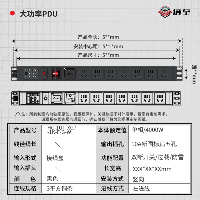 黑色封板,左进线:16A输入,1U,单相,7位10A国标扁五孔,1位红色双断开关(带盖),过载按钮,防雷,16A接线盒,M20防水接头