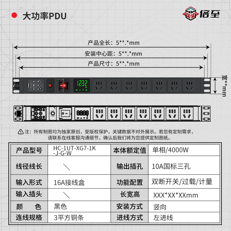 黑色封板,左进线:16A输入,1U,单相,7位10A国标扁五孔,1位红色双断开关(带盖),过载按钮,数显,16A接线盒,M20防水接头