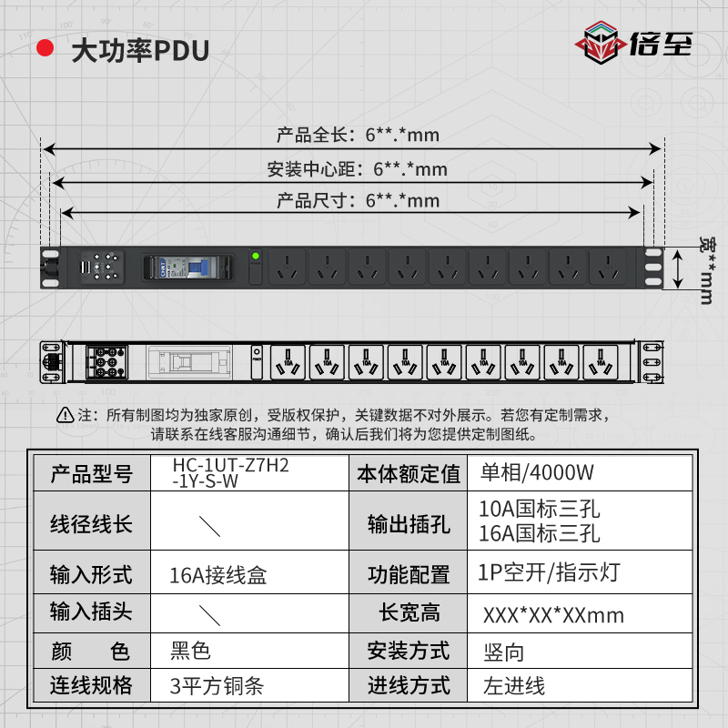 黑色封板,左进线:16A输入,1U,单相,7位10A国标三孔,2位16A国标三孔,1位1P空开,1位指示灯,16A接线盒,M20防水接头