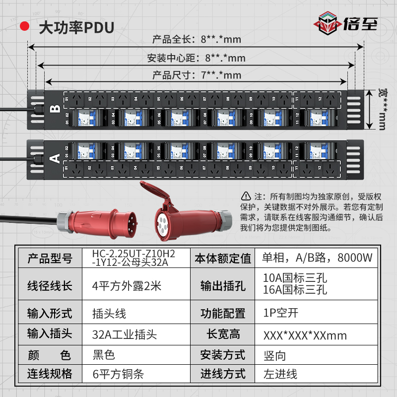 AB路,左进线:32A输入,2.25U,单相电,10位10A国标三插孔,2位16A国标三插孔,5位10A 2P空开,12位16A 1P空开,32A工业插头4平方2米线,M25防水接头