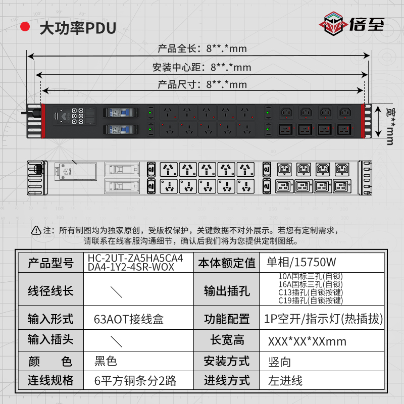 红色封板,左进线:63A输入,2U,单相电,5位10A国标三插孔(按键),5位10A国标三插孔(按键),4位C13插孔(按键),4位C19插孔(按键),4位热插拔指示灯,2位1P空开,63AOT接线盒,M32防水接头