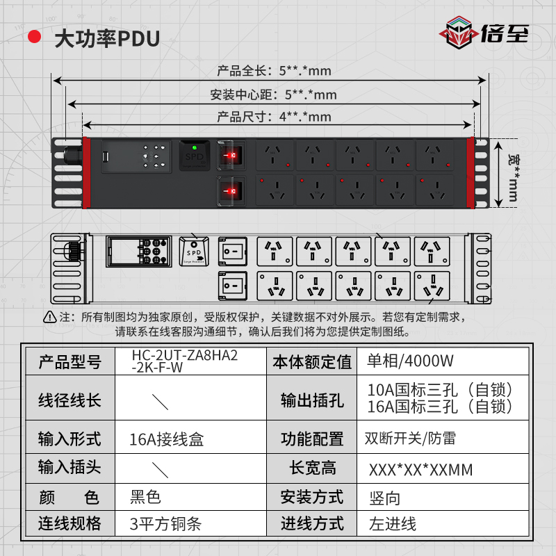 红色封板,左进线:16A输入,2U,单相电,8位10A国标三插孔(按键),2位10A国标三插孔(按键),2位红色双断开关(带盖),防雷,16A加长接线盒,M20防水接头