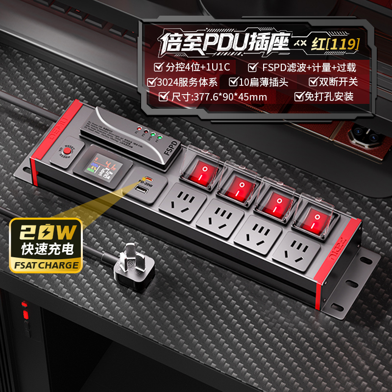 2U非标尺寸,红色封板红色开关,左侧进线:250V10A输入,4位10A新国标扁五孔+4位红色双断开关(带盖),F模块滤波防雷(客供)+过载+全显计量 (彩色)+1U1C,2米1.5平线+10A国标三脚插头