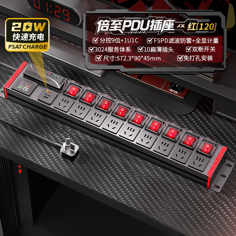 2U非标尺寸,红色封板红色开关,左侧进线:250V10A输入,9位10A新国标扁五孔+9位红色双断开关(带盖),F模块滤波防雷(客供)+全显计量 (彩色)+1U1C,2米1.5平线+10A国标三脚插头