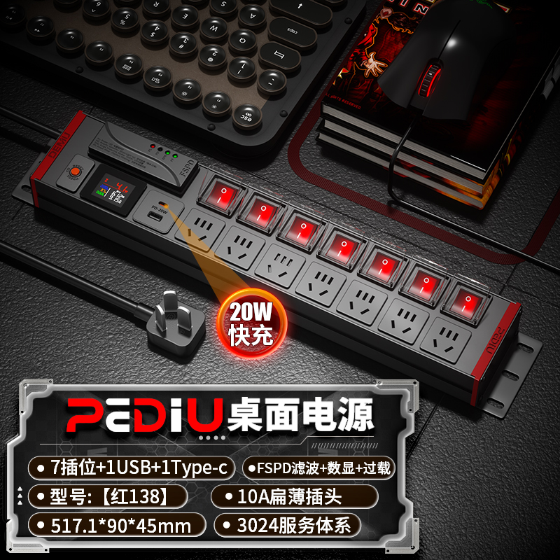 红色封板,2U板体 非标尺寸:250V 10A输入,7位10A新国标+7位红色双断开关(带盖)+F模块滤波防雷(客供)+全显计量(彩色)+过载+1位20W模块(1U1C),2米1.5平线+10A国标三脚插头