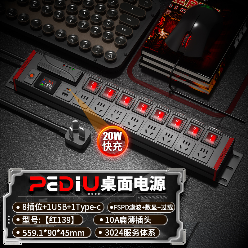 红色封板,2U板体 非标尺寸:250V 10A输入,8位10A新国标+8位红色双断开关(带盖)+F模块滤波防雷(客供)+全显计量(彩色)+过载+1位20W模块(1U1C),2米1.5平线+10A国标三脚插头