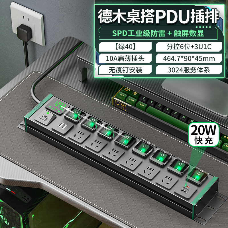 绿色封板绿色开关,2U非标尺寸:250V 10A输入,6位10A国标扁五孔+1位2USB+1位1U1C输出,配置8位绿色双断开关+计量+防雷,1.5平2米线+10A国标三脚插头