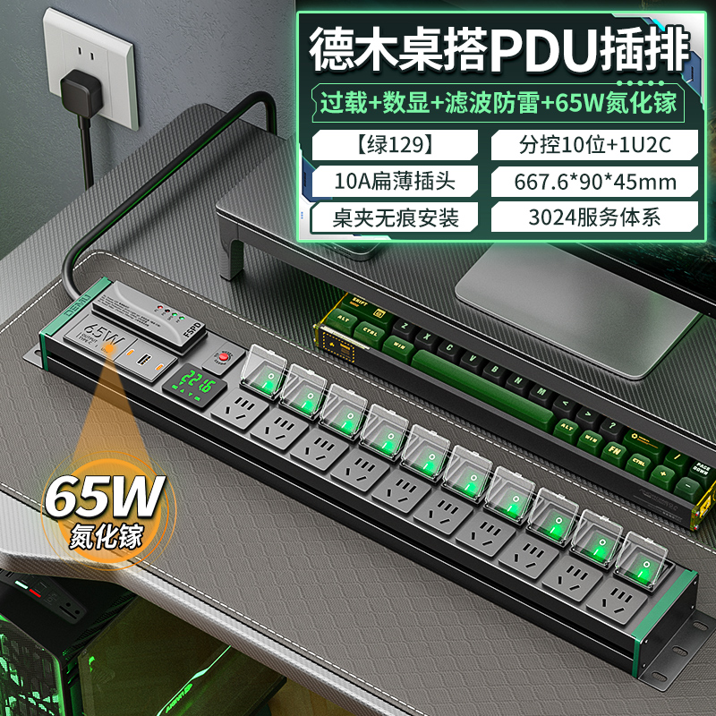 2U非标尺寸,绿色封板绿色开关,左进线 ,250V 10A输入,10位10A新国标扁五孔,滤波防雷模块(客供)