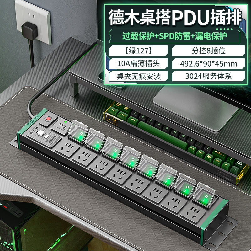 2U非标尺寸,绿色封板绿色开关,左进线 ,250V 10A输入,8位10A新国标扁五孔,防雷+过载保护+L模块-PLP