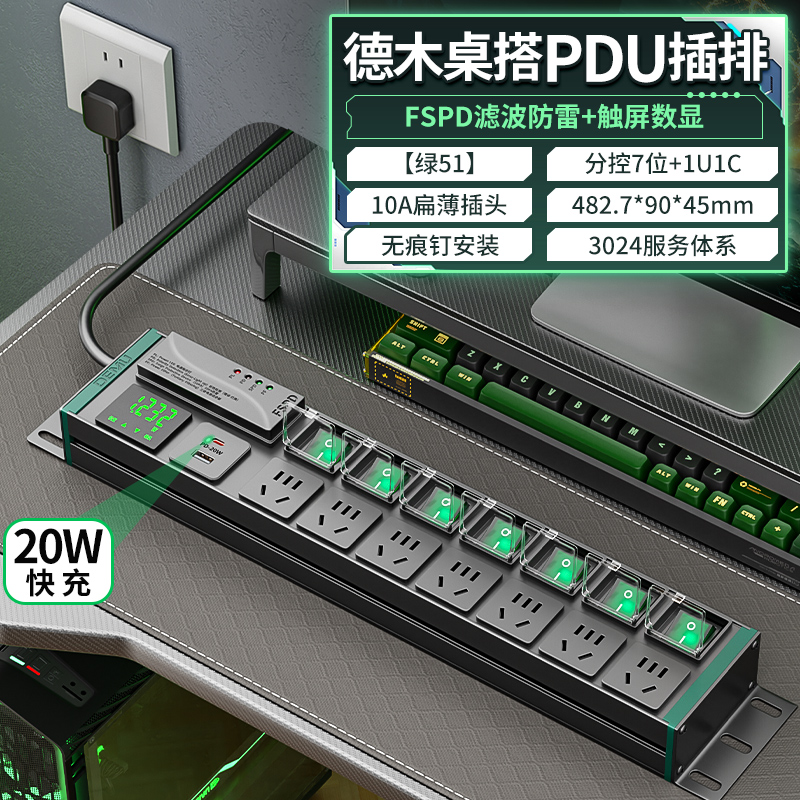 绿色封板蓝色开关,2U非标尺寸:250V 10A输入,7位10A新国标扁五孔,7位绿色双断开关(带盖),滤波,计量,20W模块(1U1C),1.5平2米线+10A国标三脚插头