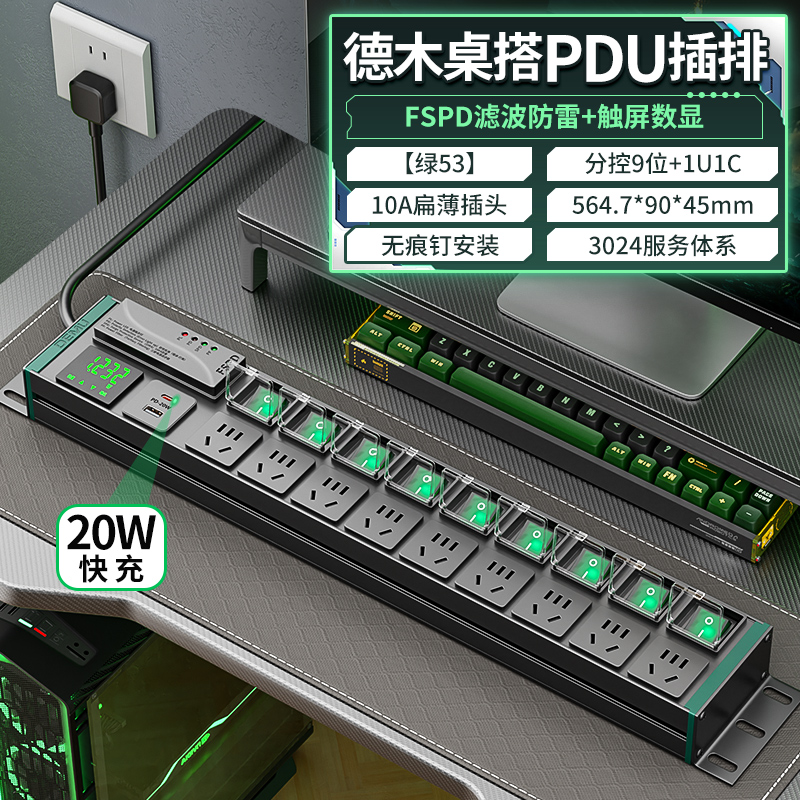 绿色封板蓝色开关,2U非标尺寸:250V 10A输入,9位10A新国标扁五孔,9位绿色双断开关(带盖),滤波,计量,20W模块(1U1C),1.5平2米线+10A国标三脚插头
