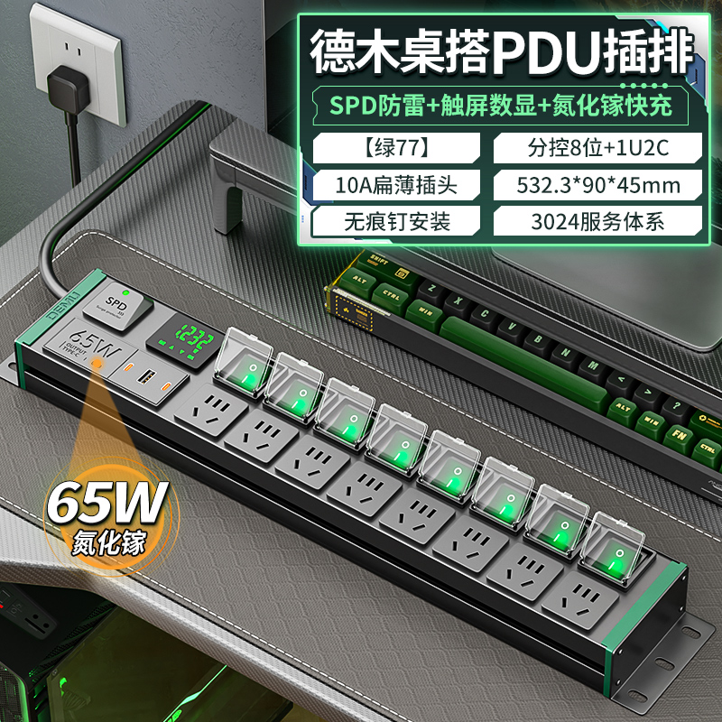 绿色封板绿色开关,2U标准尺寸:250V 10A输入,6位10A国标扁五孔+7位绿色双断开关(带盖),配置F滤波模块+计量+1位65W模块,2米1.5平线+10A国标三脚插头