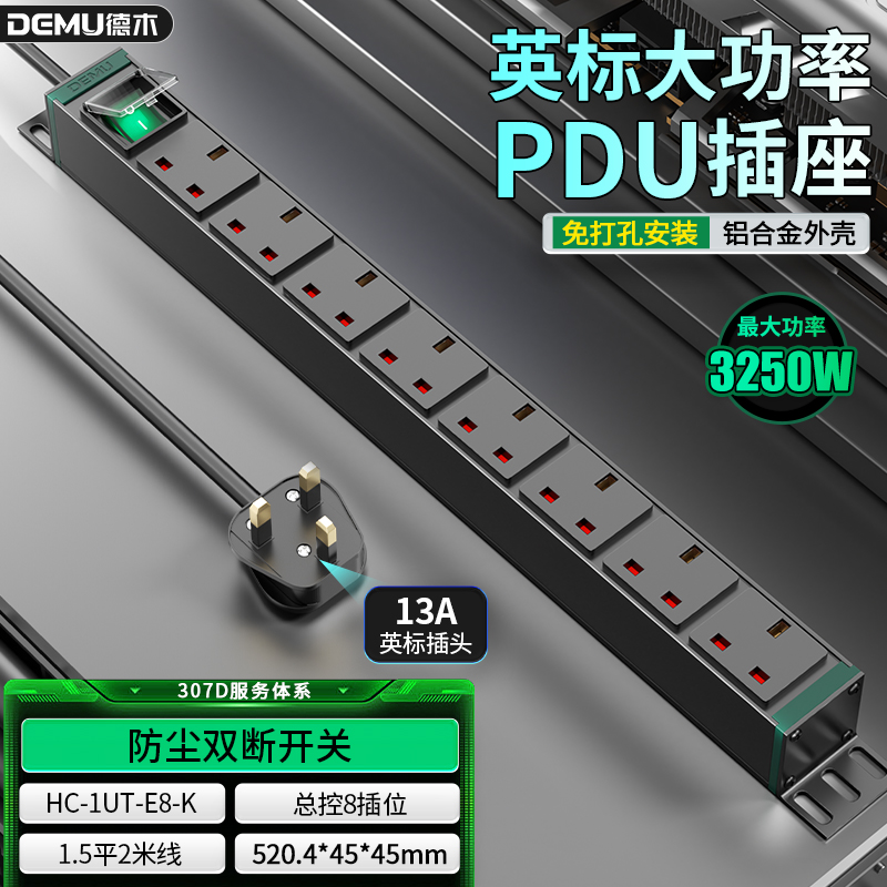 绿色封板绿色开关,1U非标尺寸:250V 13A输入,8位13A英标孔输出,1位绿色双断开关(带盖),1.5平2米线+英标插头