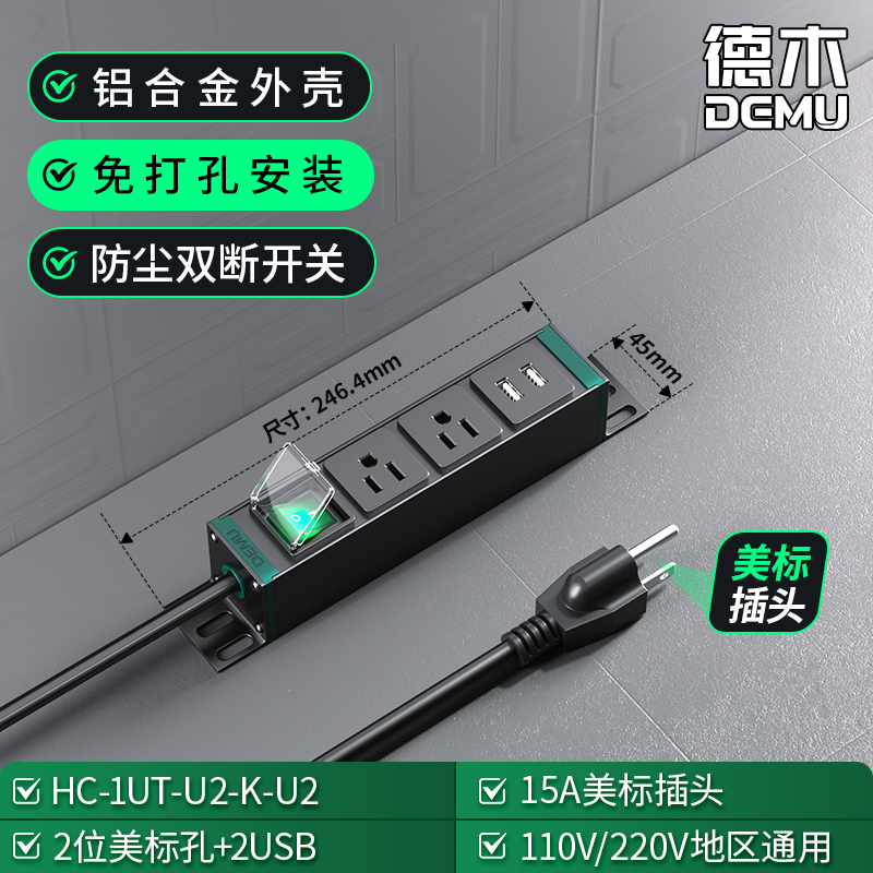 绿色封板绿色开关,1U非标尺寸:110V 15A输入,2位15A美标孔输出,1位绿色双断开关(带盖)+1位2USB,14号线+美标插头