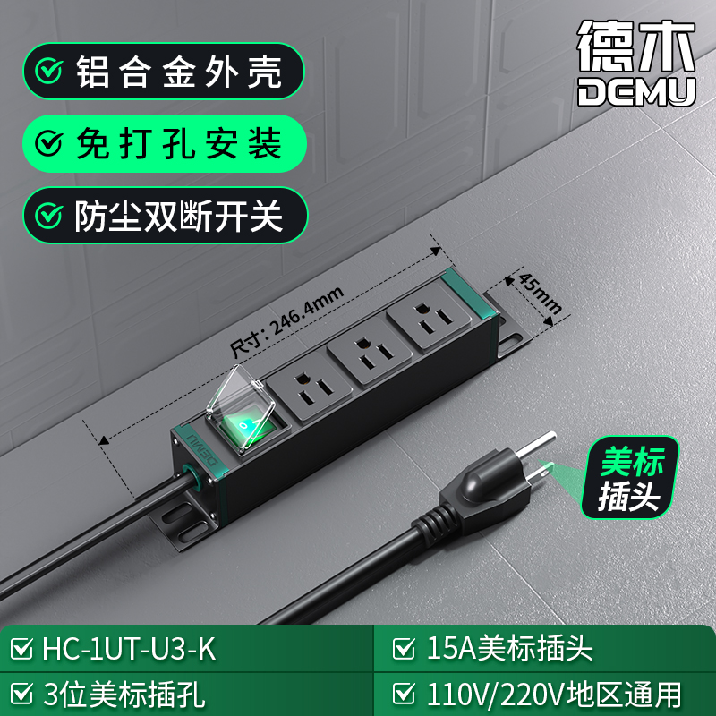绿色封板绿色开关,1U非标尺寸:110V 15A输入,3位15A美标孔输出,1位绿色双断开关(带盖),14号线+美标插头