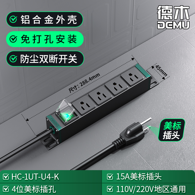 绿色封板绿色开关,1U非标尺寸:110V 15A输入,4位15A美标孔输出,1位绿色双断开关(带盖),14号线+美标插头