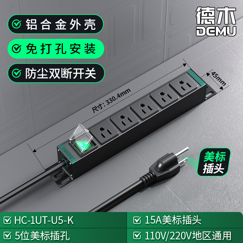绿色封板绿色开关,1U非标尺寸:110V 15A输入,5位15A美标孔输出,1位绿色双断开关(带盖),14号线+美标插头