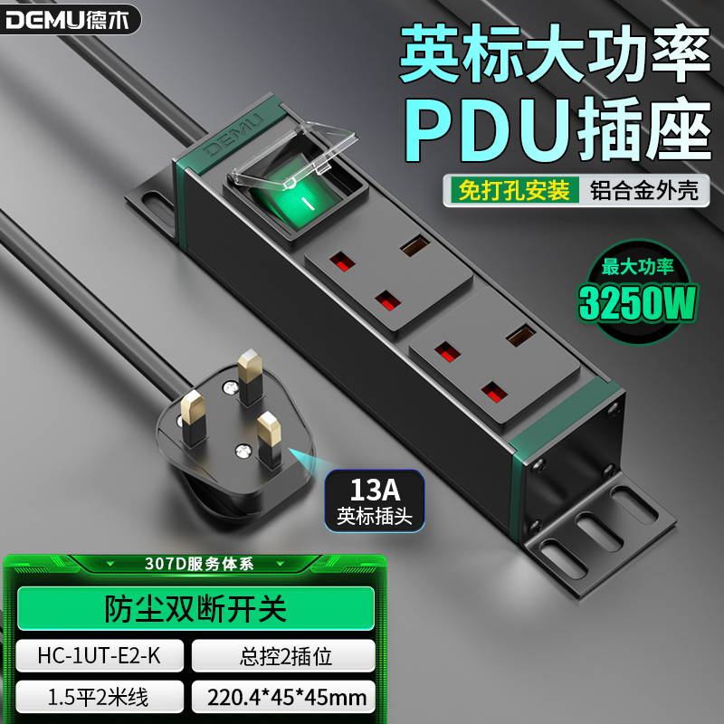 绿色封板绿色开关,1U非标尺寸:250V 13A输入,2位13A英标孔输出,1位绿色双断开关(带盖),1.5平2米线+英标插头
