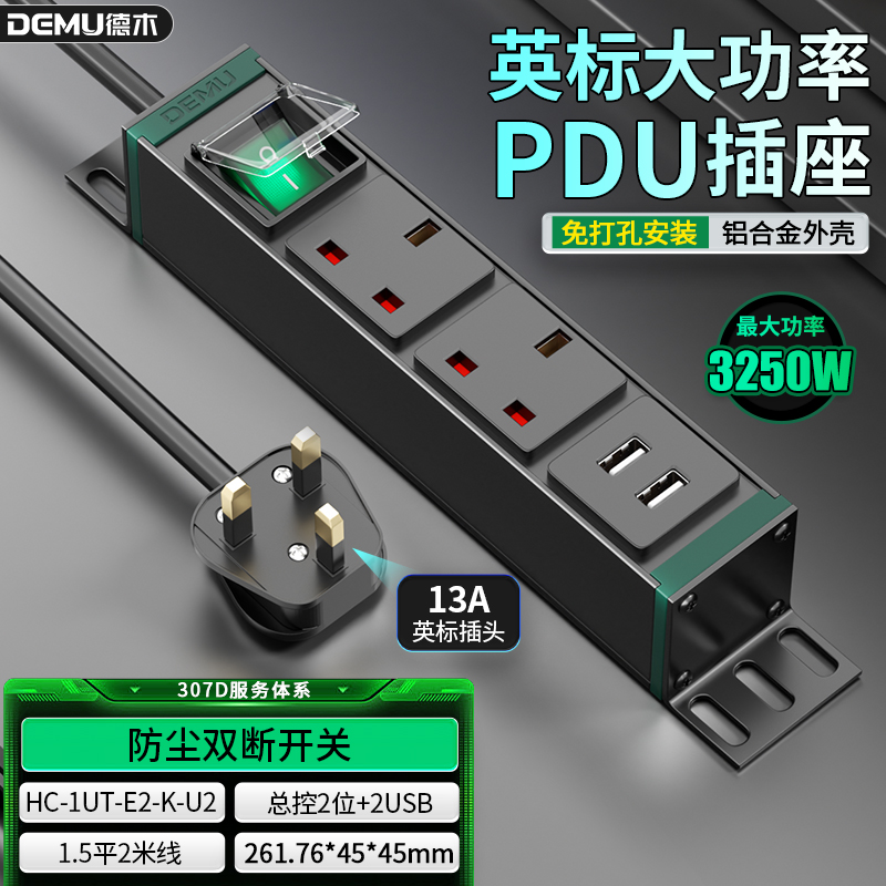绿色封板绿色开关,1U非标尺寸:250V 13A输入,2位13A英标孔输出,1位绿色双断开关(带盖)+1位2USB,1.5平2米线+英标插头