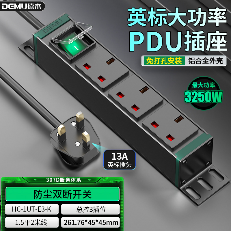 绿色封板绿色开关,1U非标尺寸:250V 13A输入,3位13A英标孔输出,1位绿色双断开关(带盖),1.5平2米线+英标插头
