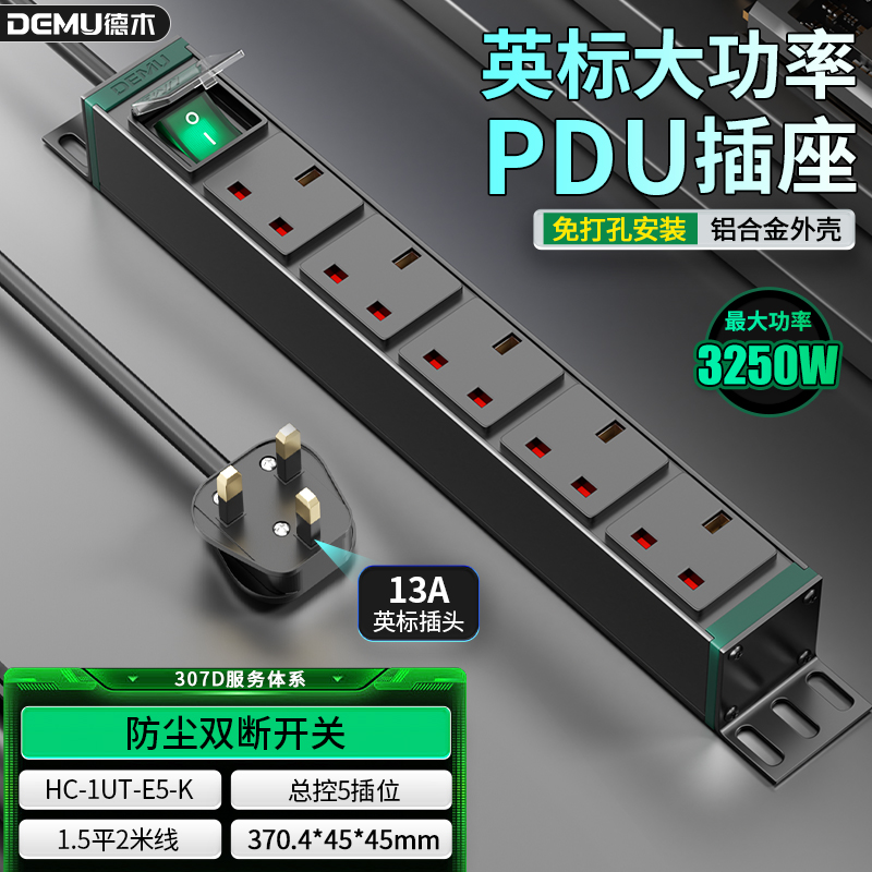 绿色封板绿色开关,1U非标尺寸:250V 13A输入,5位13A英标孔输出,1位绿色双断开关(带盖),1.5平2米线+英标插头