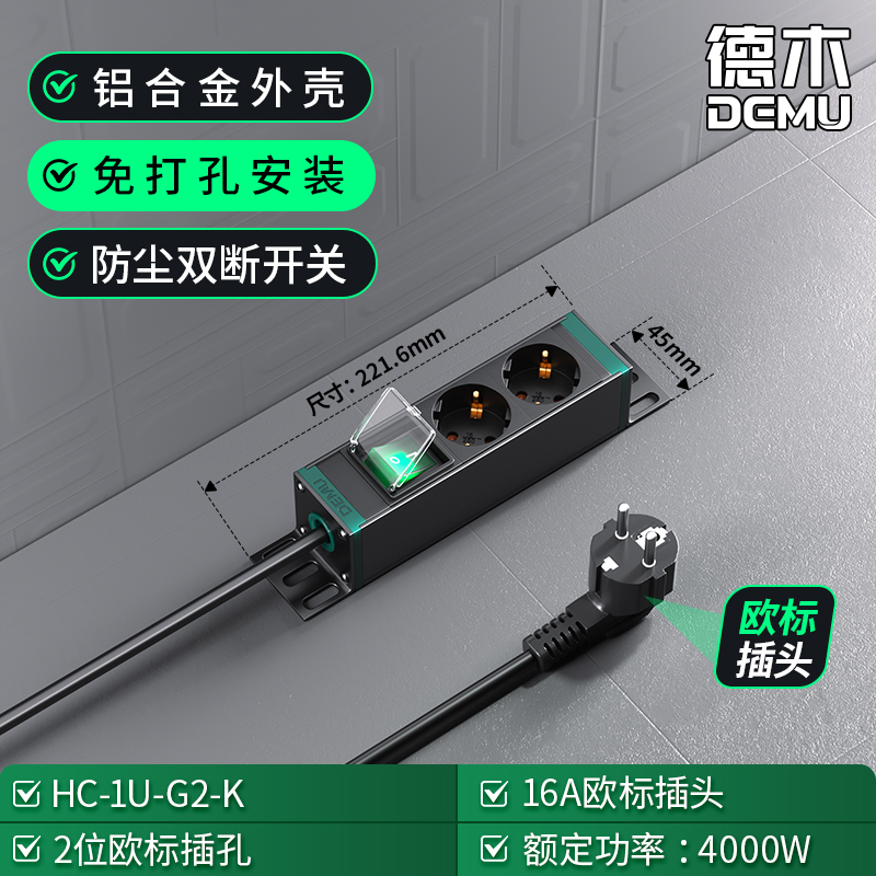 绿色封板绿色开关,1U非标尺寸:250V 16A输入,2位16A欧标孔输出,1位绿色双断开关(带盖),1.5平2米线+欧标插头