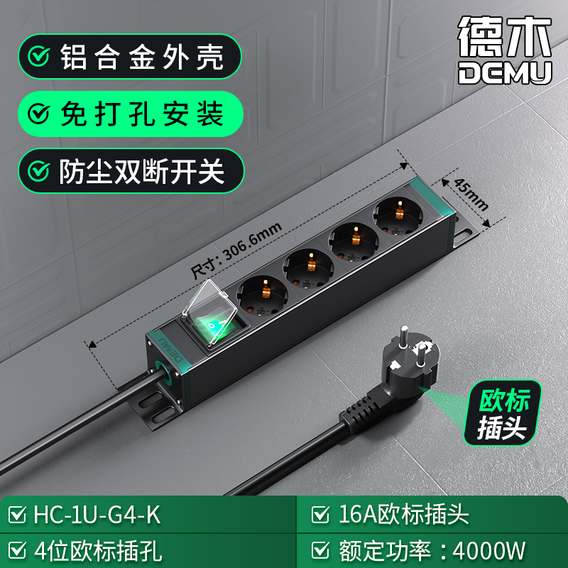 绿色封板绿色开关,1U非标尺寸:250V 16A输入,4位16A欧标孔输出,1位绿色双断开关(带盖),1.5平2米线+欧标插头