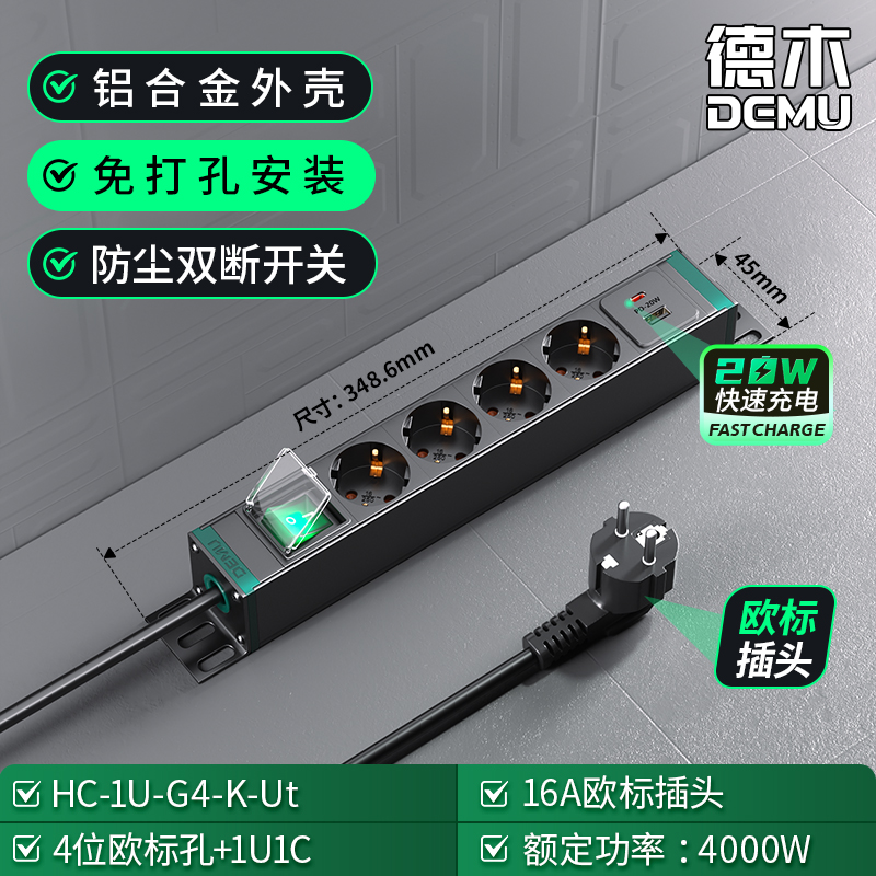 绿色封板绿色开关,1U非标尺寸:250V 16A输入,4位16A欧标孔输出,1位绿色双断开关(带盖)+1U1C,1.5平2米线+欧标插头