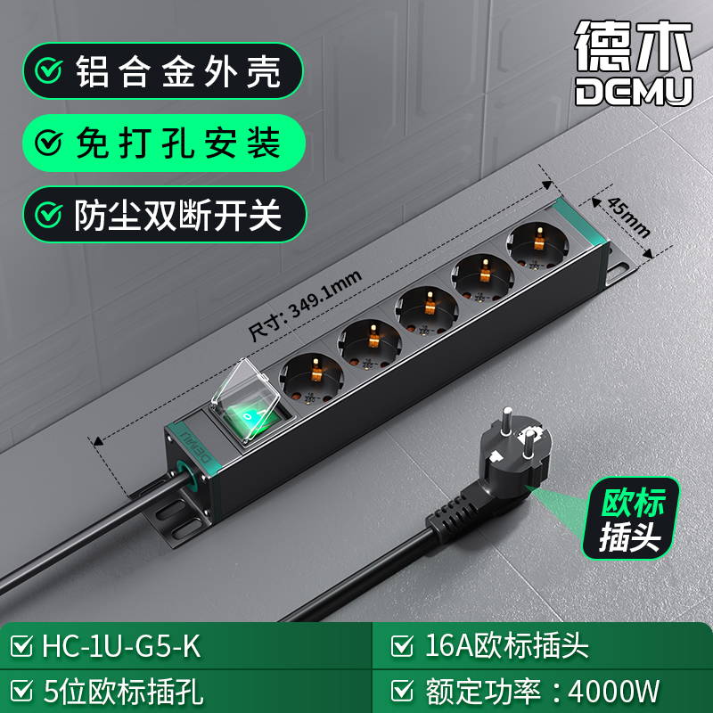 绿色封板绿色开关,1U非标尺寸:250V 16A输入,5位16A欧标孔输出,1位绿色双断开关(带盖),1.5平2米线+欧标插头