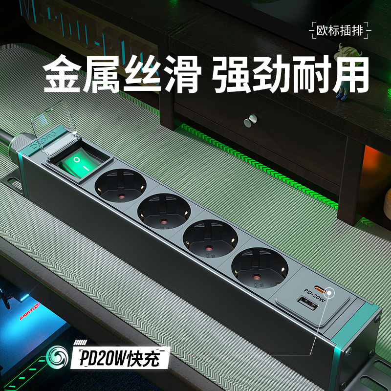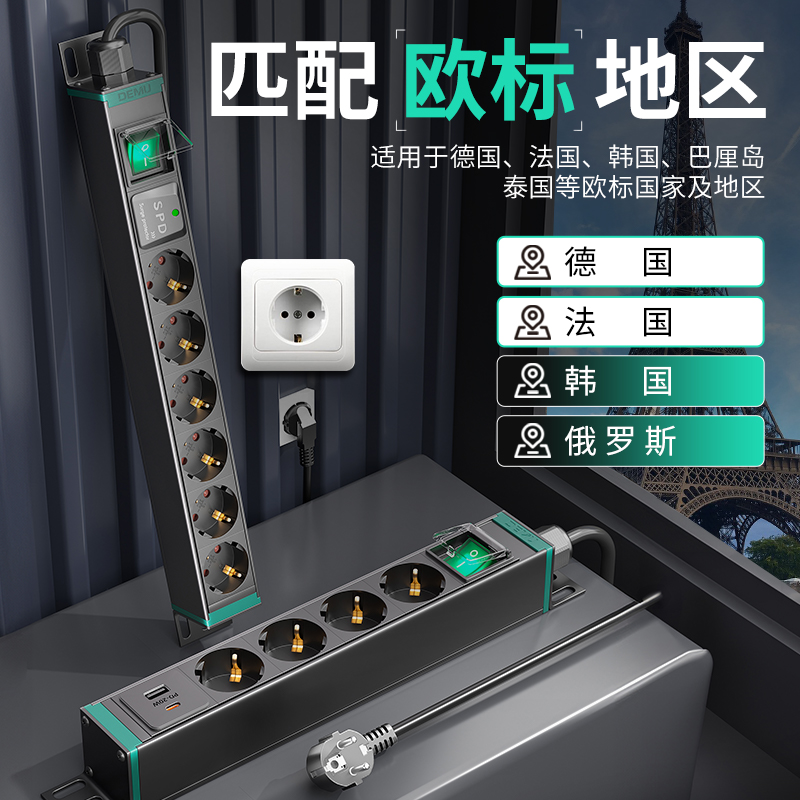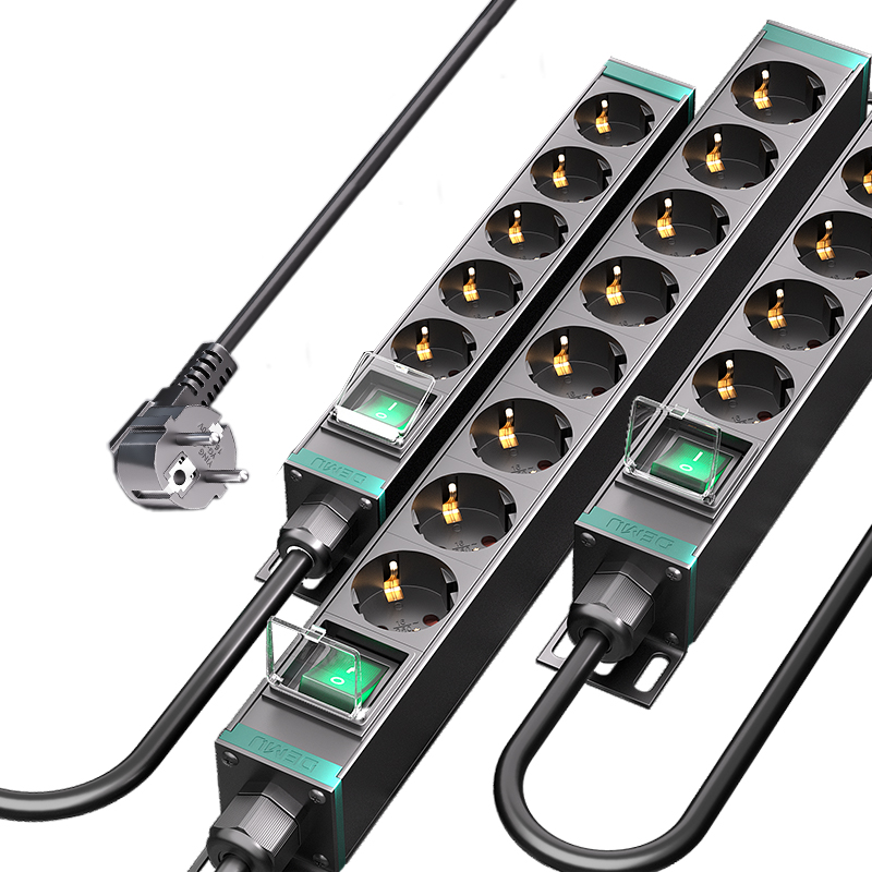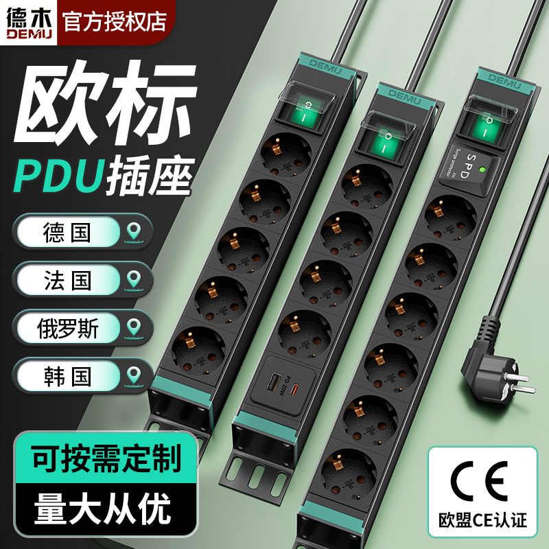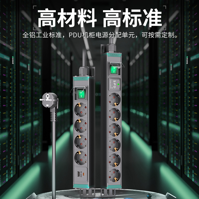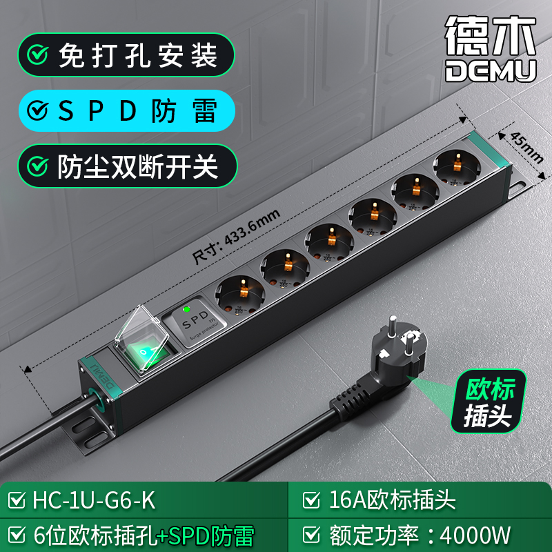 绿色封板绿色开关,1U非标尺寸:250V 16A输入,6位16A欧标孔输出,1位绿色双断开关(带盖)+防雷,1.5平2米线+欧标插头