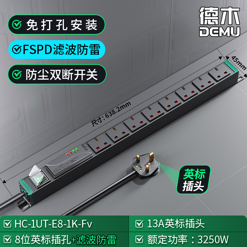 绿色封板绿色开关,1U非标尺寸,左侧进线:250V 13A输入,8位13A英标孔输出,配置F滤波模块+1位绿色双断开关(带盖),1.5平2米线+英标插头