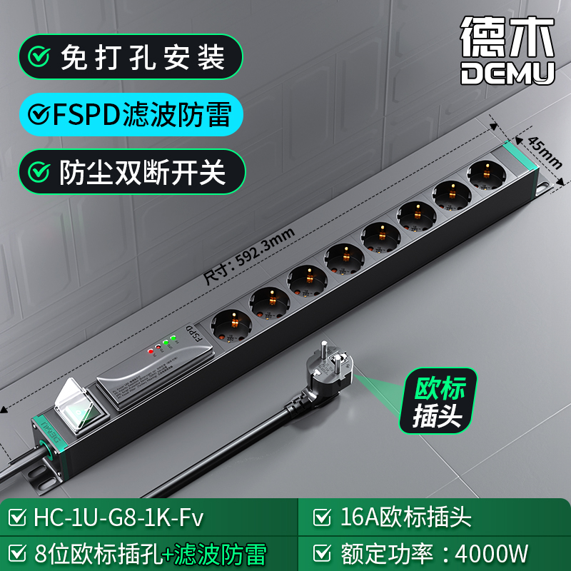 绿色封板绿色开关,1U非标尺寸,左侧进线:250V 16A输入,8位16A欧标孔输出,配置F滤波模块+1位绿色双断开关(带盖),1.5平2米线+欧标插头