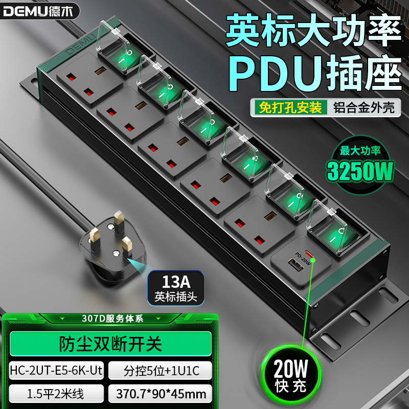 绿色封板绿色开关,2U非标尺寸:250V 13A输入,5位13A英标孔输出,6位绿色双断开关(带盖)+1U1C,1.5平2米线+英标插头