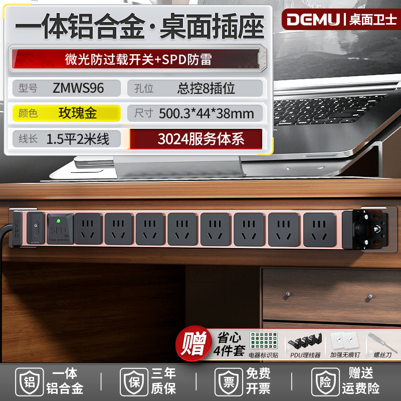金粉板体 1U标准尺寸:250V 10A输入,8位10A新国标+防雷+微光过载总开关,2米1.5平线+11A国标三脚插头
