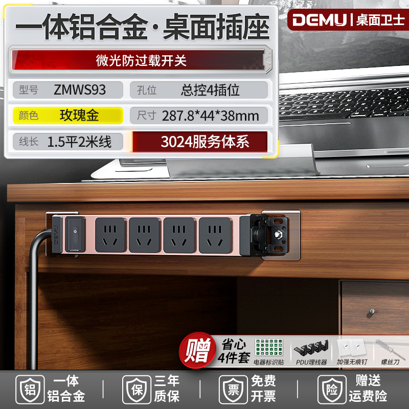 金粉板体 1U非标尺寸:250V 10A输入,4位10A新国标+微光过载总开关,2米1.5平线+10A国标三脚插头