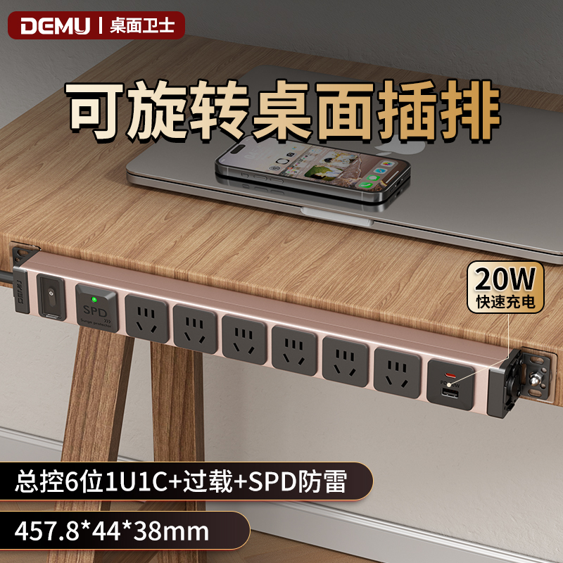 金粉板体 1U非标尺寸:250V 10A输入,6位10A新国标+微光过载总开关+防雷+1位20W模块(1U1C),2米1.5平线+10A国标三脚插头