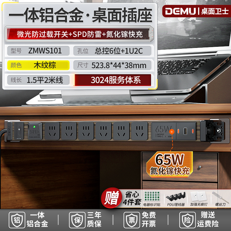 木纹板体 1U非标尺寸:250V 10A输入,6位10A新国标+防雷+1位65W模块+微光过载总开关,2米1.5平线+10A国标三脚插头