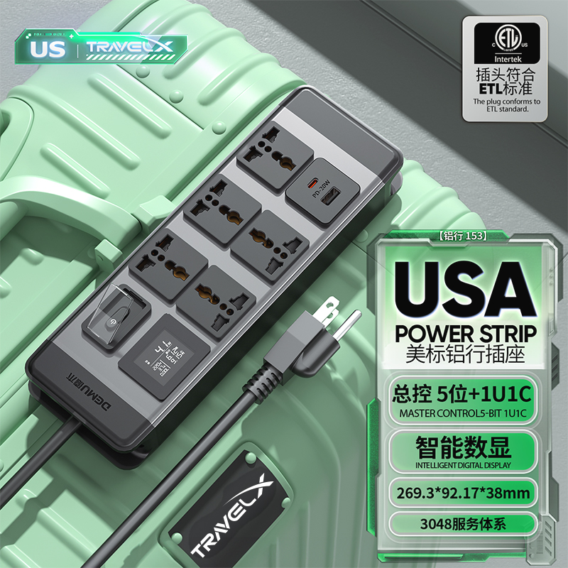 银翼板体 2U非标尺寸:左侧进线:250V 15A输入,5位10A多用孔(带保护门)+微光过载总开关+20W 1U1C+全显计量(白色)+美标插头