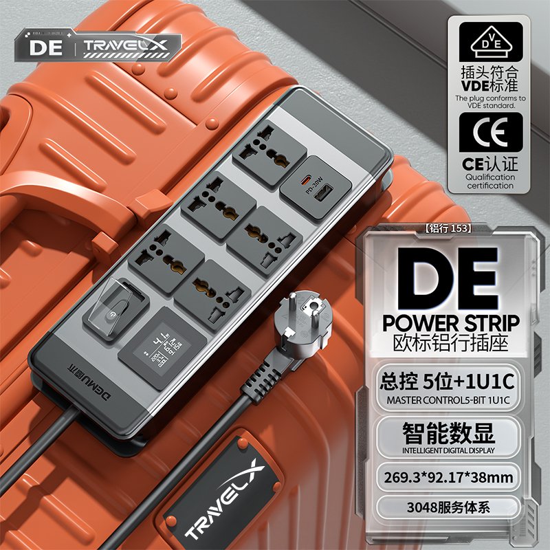银翼板体 2U非标尺寸:左侧进线:250V 16A输入,5位10A多用孔(带保护门)+微光过载总开关+20W 1U1C+全显计量(白色)+欧标插头