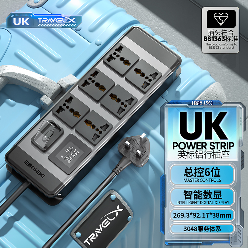 银翼板体 2U非标尺寸:左侧进线:250V 13A输入,6位10A多用孔(带保护门)+微光过载总开关+全显计量(白色)+英标插头
