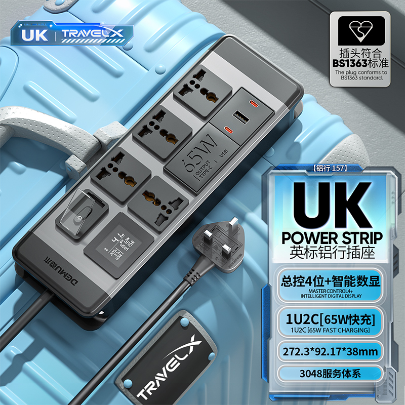 银翼板体 2U非标尺寸:左侧进线:250V 13A输入,4位10A多用孔(带保护门)+微光过载总开关+65W 1U2C+全显计量(白色)+英标插头